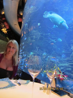nar man forst anlander aker man ubat ner till restaurangen. Inte en riktig saklart men en simulator. Lite kul och annorlunda. Restaurangen ar nog den vackraste jag sett och det ar som att stiga in i en undervattensvarld. I mitten ar ett gigantiskt golv till tak akvarium med turkost vatten och massor av fargglada fiskar och hajar.Vi at har 2011 pa var 1 manadsdag. Dave hade sagt till nar vi bokade att vi firade anniversary (men inte att det bara var 1 man) sa vi fick en tarta med oss nar vi gick. Vi at avsmaknings-menyn med tillhorande vin-paket. Valdigt gott var det men igen inte i klass med manga avsmakningsmenyer vi testat i Stockholm och i London. Men upplevelsen och den vackra restaurangen samt den kunniga personalen/sommaliern gor det helt vart besoket.